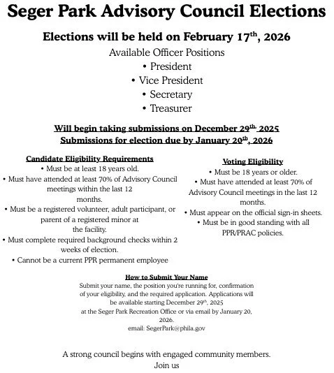 The Seger Park Advisory Council, affiliated with Philadelphia Recreation Advisory Council, manages Seger Park with the support of Philadelphia Parks & Recreation.